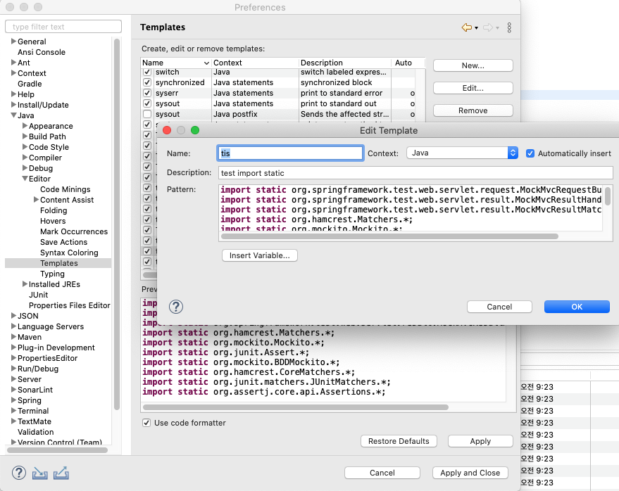 첫번째, sysout, main 처럼 java template에 import static 구문을 등록해 놓고 필요한 경우 자동 생성해서 쓰는 방법.
