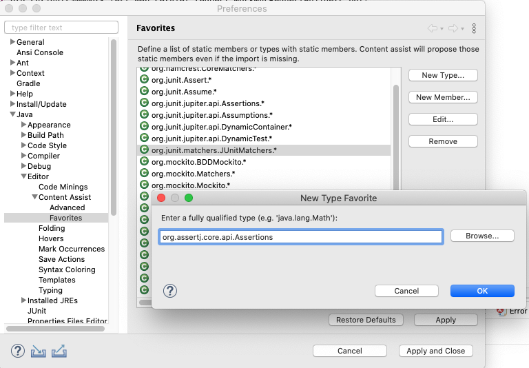 두번째, java favorite에 즐겨쓰는 클래스를 등록하고 Code Assist를 통해서 import 받는 방법입니다.