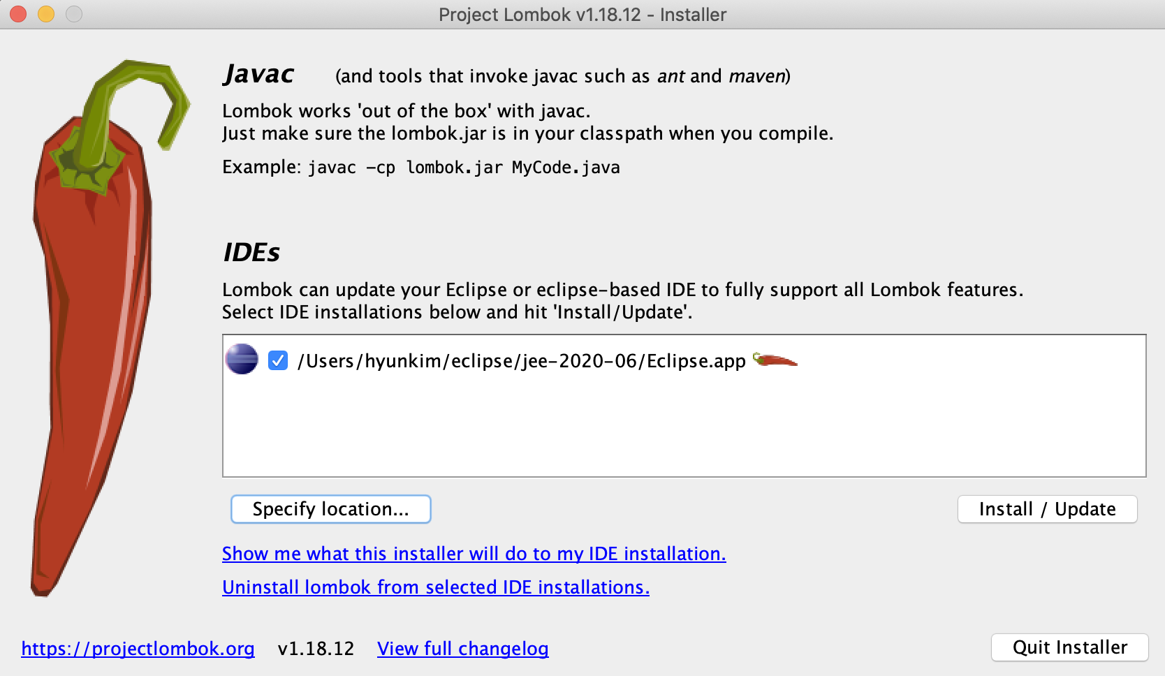 Specify location에서 설치하려는 이클립스 디렉토리를 설정하고 install / update 버튼을 클릭하면 끝납니다.
