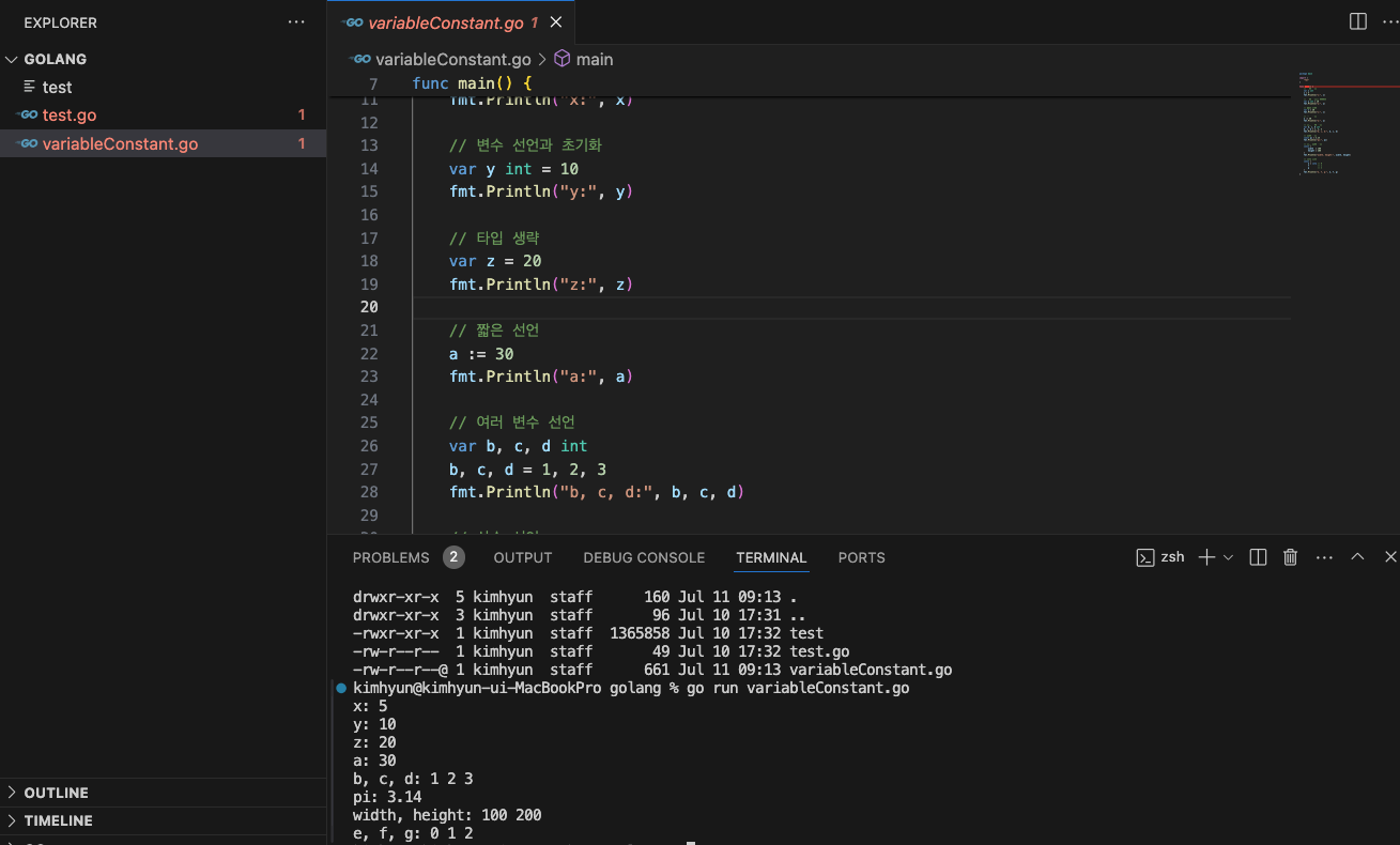 이 예제는 Go 언어에서 변수와 상수를 선언하고 사용하는 방법을 보여줍니다. 변수는 데이터를 저장하고 변경할 수 있으며, 상수는 변경되지 않는 값을 저장하는 데 사용됩니다. iota는 상수 그룹 내에서 자동으로 증가하는 값을 생성하는 데 유용합니다.